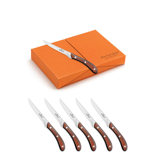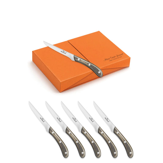 What truly sets Alain Saint-Joanis steak knives apart are their distinctive handles — available in an array of materials including rare woods, marbled resin, horn, mother of pearl, and tortoiseshell-inspired finishes. Whether styled for classic refinement or modern minimalism, each knife offers perfect balance and a comfortable grip, making every meal feel like a special occasion.