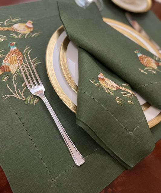 Pheasant Hand-Embroidered Table Linens Collection in Hunter Green