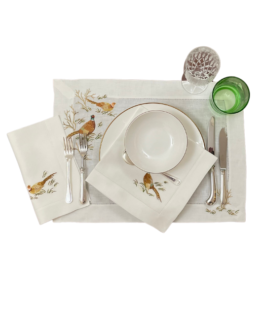 Pheasant Hand-Embroidered Table Linens Collection in White