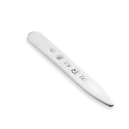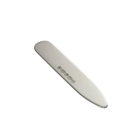 Classic sterling silver men's collar stays crafted using mirror-polished 925 sterling silver. Add a complimentary set of initials, name, or monogram to make a unique sterling silver collar stay pair. Various sizes and styles are available to ensure our dress shirt collar stays are always the proper fit. The fine point at the end will ensure your collars are always correct. Shown is a pair of Sterling Silver Collar Stiffeners by Carrs Silver.