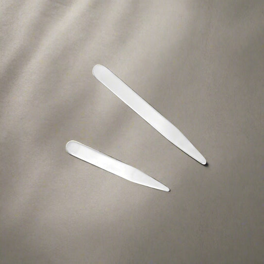 Classic sterling silver collar stays made in the United States and England. Keep dress shirt collars crisp and in place with a pair of silver collar stays. Add a personal touch with a complimentary engraving - for a unique pair of custom collar stays. The two sizes of the classic Sterling Silver Collar Stays are shown.