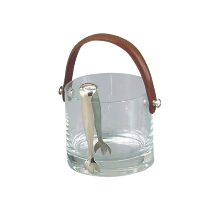 Crystal Ice Bucket with Leather Handle and Knobs in Silverplate