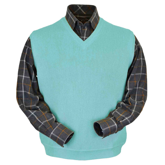 Crafted in Scotland using premium yarns from Z. Hinchliffe of Yorkshire, England, our wide selection of men's sweater vests includes cashmere, camel hair, and lambswool options. Perfect for the office or the golf course, our alpaca vests are blended with Merino wool for added durability and feature Peruvian alpaca fiber. For a more formal touch, we offer men's cashmere sleeveless cardigans (gilet vest), ideal for layering under a blazer or for a touch of coordinating color. Whether you select a traditional cashmere vest, one of our baby alpaca vests, or soft & Durable Geelong Merino wool gilets and vests, we have a selection of different colors and generously cut sizes to coordinate with any outfit. The men's Cashmere Waistcoat With Two Pockets in Lapis and the men's Cashmere Slipover Vest in navy are shown.