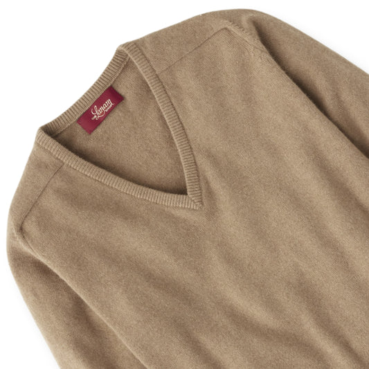 While we offer men's V neck sweaters in a range of materials, our men's cashmere pullover sweater with V-neck is knit in Scotland using premium yarns and remains a best-seller. Also popular are our men's lambswool sweater collection including V-neck jumpers with hand-set v-neck detail. We offer V-neck Merino wool sweater styles made with yarn from Geelong, Australia and knit in Hawick, Scotland. For warmer weather, we offer a Pima cotton v-neck sweater style in a range of colors. Shown is the Camel Hair V-Neck Sweater with Saddle Shoulder in undyed dark natural.