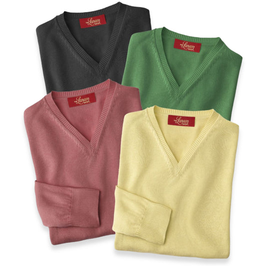 The Lanam Shop offers a wide variety of pullover v-neck sweater styles for men, including a selection of designs, including v neck cashmere sweater options knitted in Scotland using yarns from England. Also popular are Merino wool v-neck sweater styles for men - premium, soft wool sweater styles knit from Australian Merino lambswool fiber. For those seeking the very finest, we offer Johnstons of Elgin men's sweaters from Scotland in various materials and v-neck styles. The selection of men's V-neck sweaters from Peru includes 100% Pima cotton, Baby Alpaca, and extremely rare pure Vicuña. Our extensive selection of materials is out-matched only by our range of colors and sizes. Shown is the men's Cashmere V-Neck Sweater With Saddle Shoulder in bordeaux.