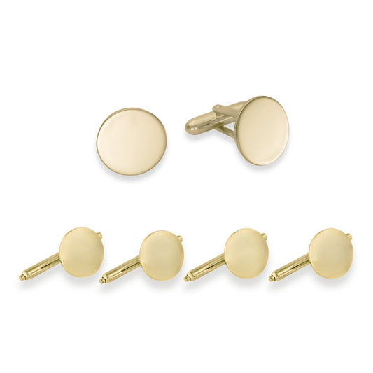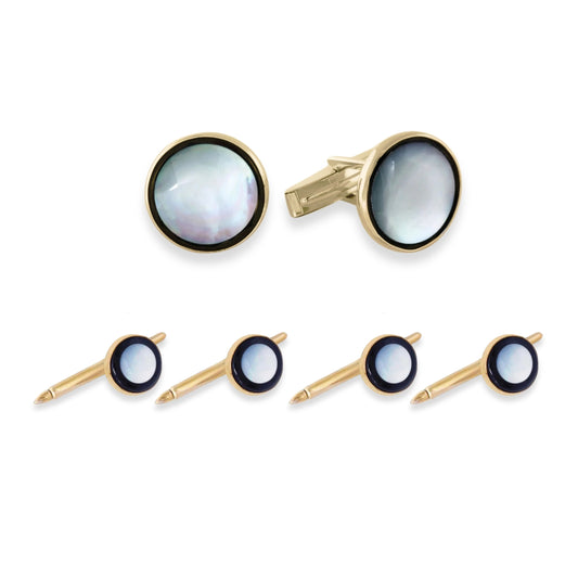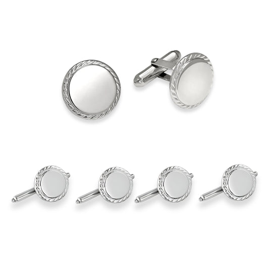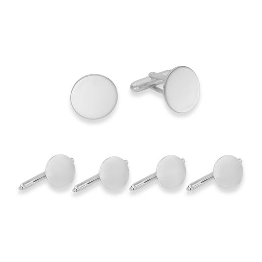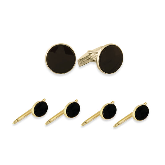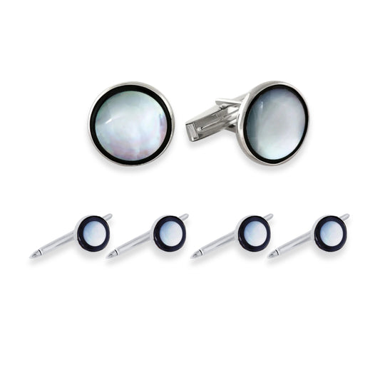 Classic formal wear tuxedo shirt studs and cufflink sets made in the United States. Traditional black onyx and mother of pearl tuxedo stud options are available set in sterling silver, or vermeil — 14K gold tuxedo studs are also available. Engravable tuxedo stud sets are available as a personalized option. Shown are the Sterling Silver Round Onyx & Mother of Pearl Tuxedo Stud Set and the Sterling Silver Round Onyx Tuxedo Stud Set.