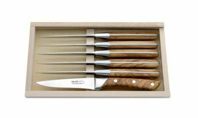 Set of six steak knives. Dishwasher safe, though hand washing is recommended to preserve the handle’s beauty.
