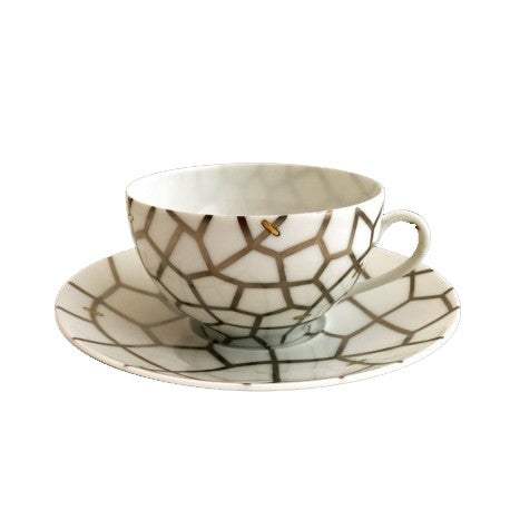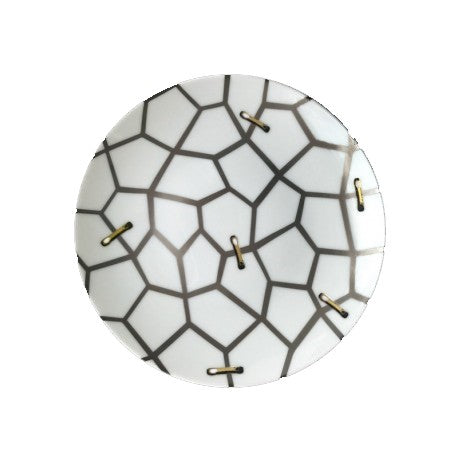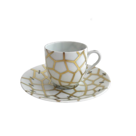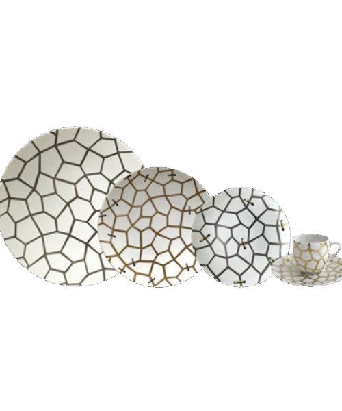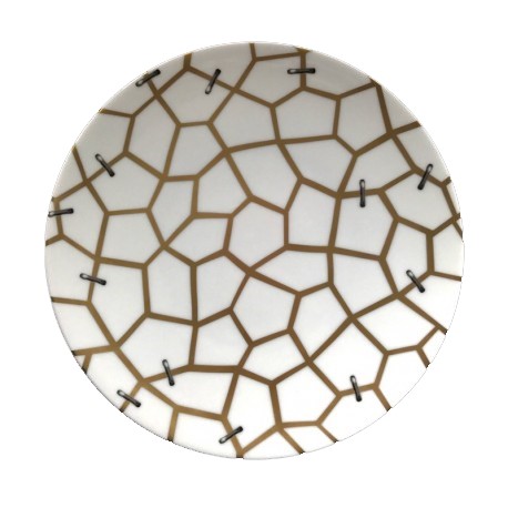 This porcelain collection of dinner, dessert table and cups named "Marks of Time" is realized in Limoges porcelain and decorated with a crackled pattern in platinum or fine gold, enhanced with clips. This collection visually pays tribute to the former know-how in porcelain restoration that used clips.