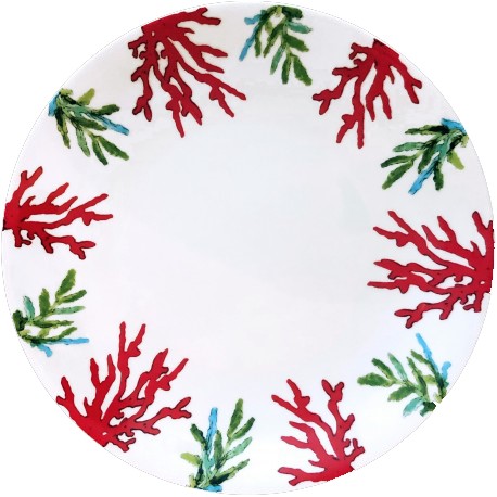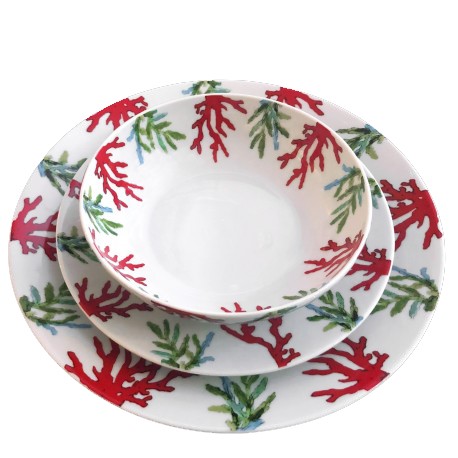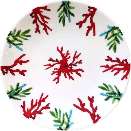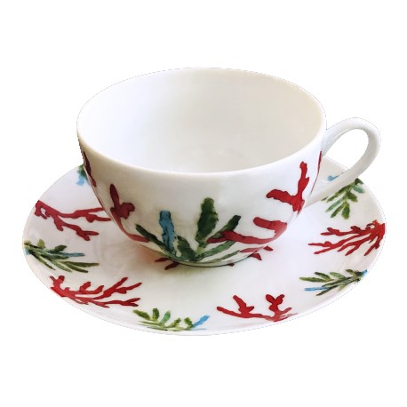 The Red Coral Collection is made of white Limoges porcelain hand-painted with coral pattern in red and green colors with a bit of blue. Each piece is hand-painted and unique. This collection is composed of various sizes of plates and cup and saucers. Perfect to bring back the sea to your table!