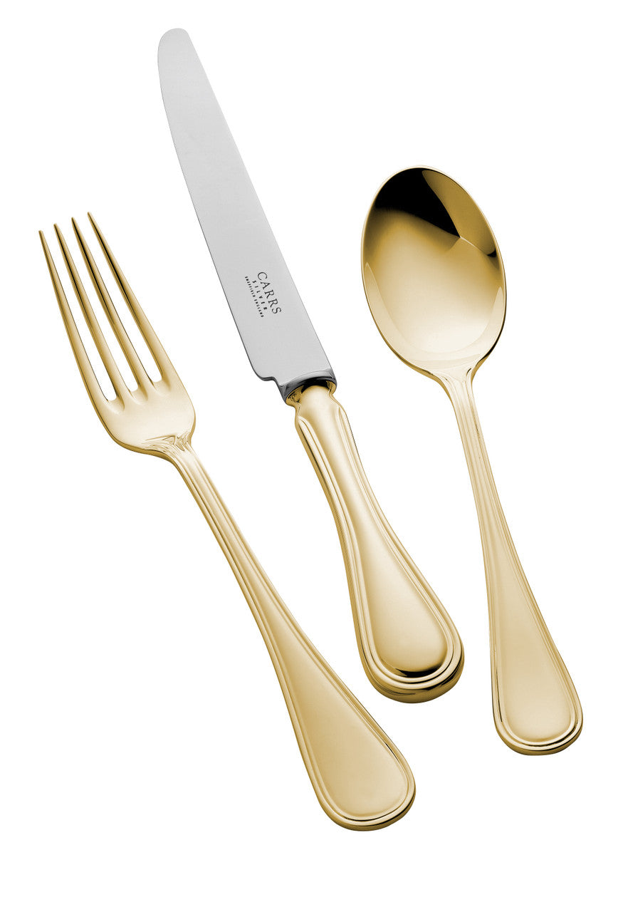Vermeil (or silver gilt as it is called in England) refers to a piece of sterling silver (or pure silver) that has been given a gold wash, resulting in a finished product that looks to be made of gold. The sterling silver base used to craft vermeil flatware at Carrs is 925 parts per 1000 silver and 75 parts per 1000 other metals, such as copper. This traditional alloy strengths the soft silver metal enabling it to be used as cutlery. A flawless glimmering finish is applied by the skilled workers at Carrs. With time and use a beautiful golden patina will develop. Best described as an “internal glow” this highly desirable optical effect is the result of microscopic surface scratches, which reflect light. The more you use it, the prettier it will be. It should be noted that the main cutlery service used at office state banquets at The White House is vermeil.