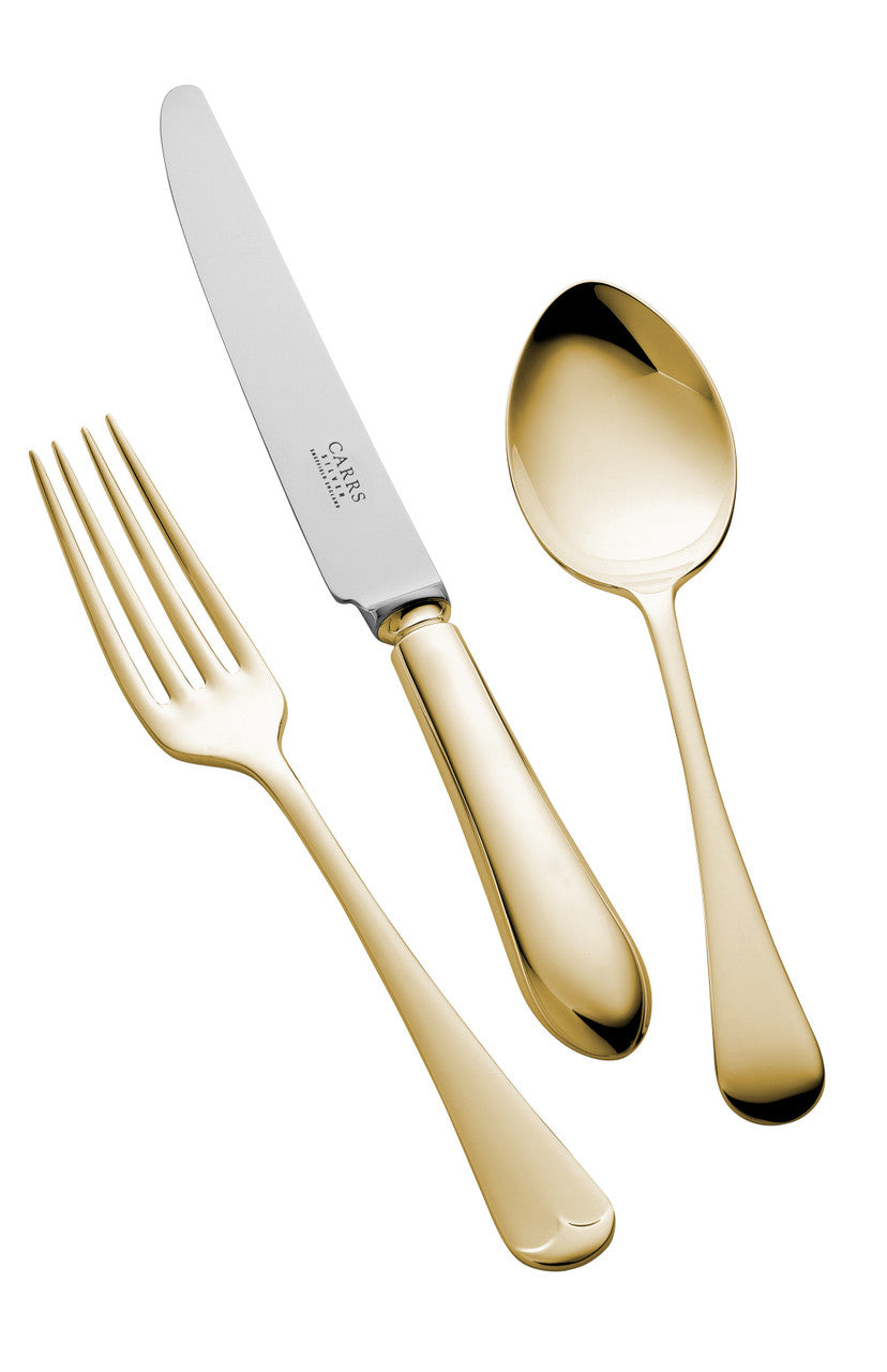 Vermeil (or silver gilt as it is called in England) refers to a piece of sterling silver (or pure silver) that has been given a gold wash, resulting in a finished product that looks to be made of gold. The sterling silver base used to craft vermeil flatware at Carrs is 925 parts per 1000 silver and 75 parts per 1000 other metals, such as copper. This traditional alloy strengths the soft silver metal enabling it to be used as cutlery. A flawless glimmering finish is applied by the skilled workers at Carrs. With time and use a beautiful golden patina will develop. Best described as an “internal glow” this highly desirable optical effect is the result of microscopic surface scratches, which reflect light. The more you use it, the prettier it will be. It should be noted that the main cutlery service used at office state banquets at The White House is vermeil.
