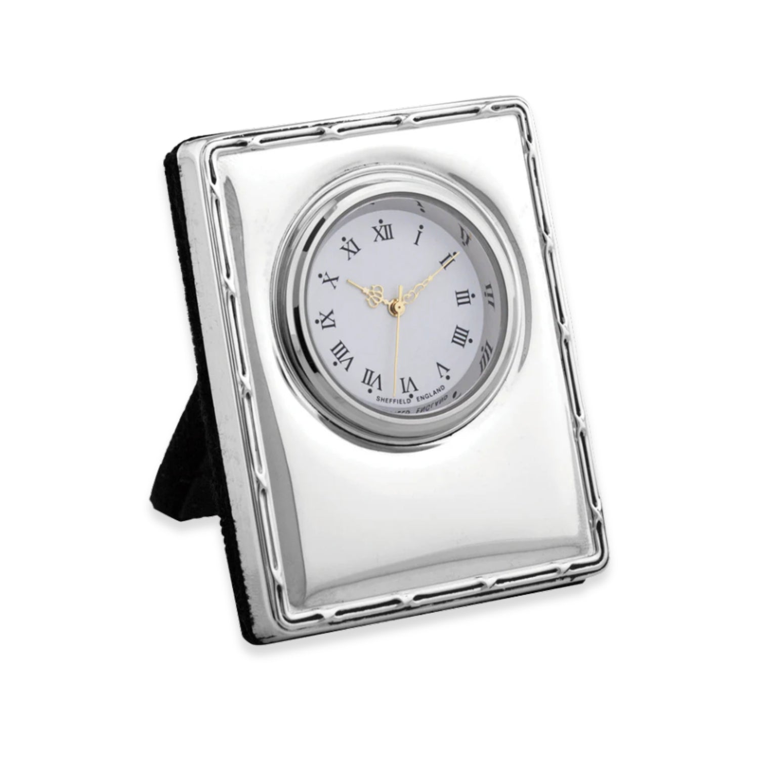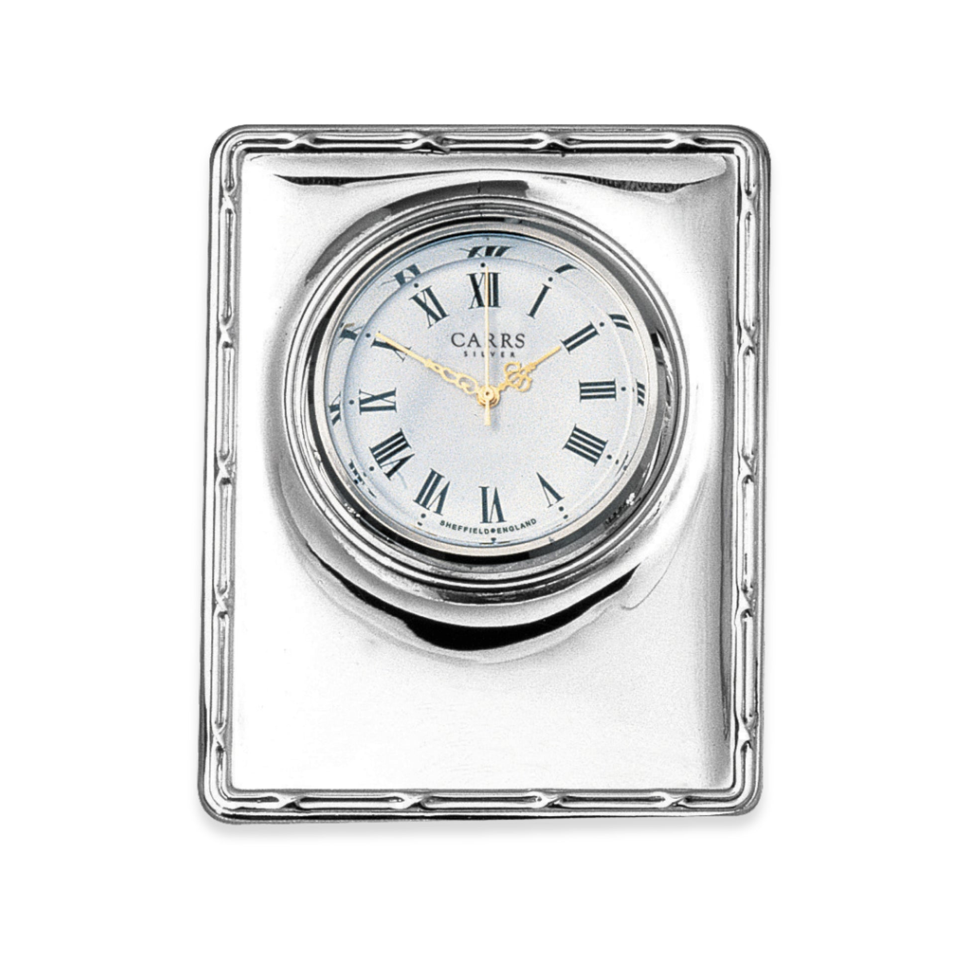 The Carrs Silver Reed & Ribbon Clock features a finely detailed border in hallmarked sterling silver — an elegant timepiece handcrafted in Sheffield, ideal for desks or gifting.