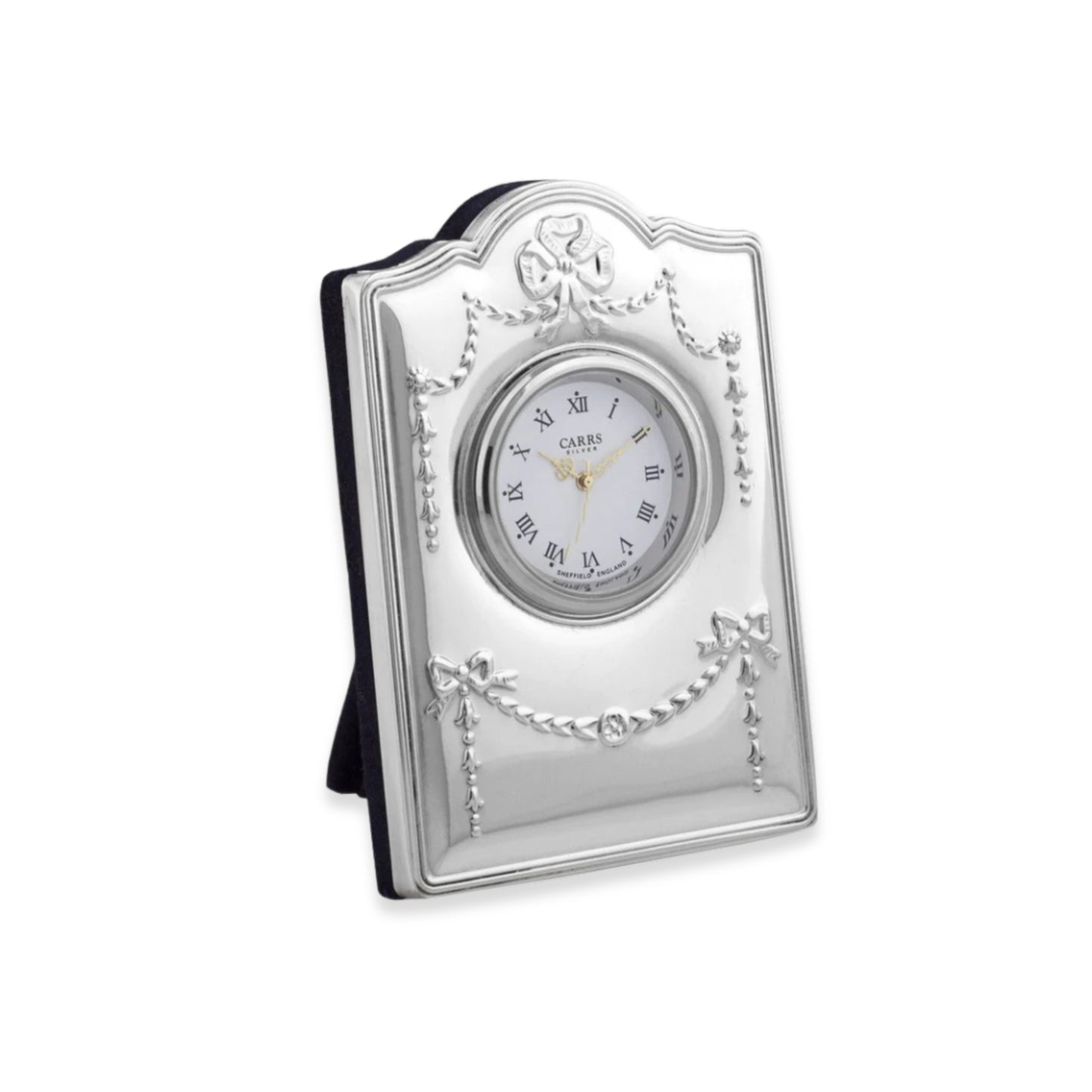 The intricate raised border surrounds a crisp white dial with classic black Roman numerals and delicate hands, offering both visual appeal and easy readability. Each clock is fully hallmarked by the Sheffield Assay Office, confirming its authenticity, quality, and sterling silver content.