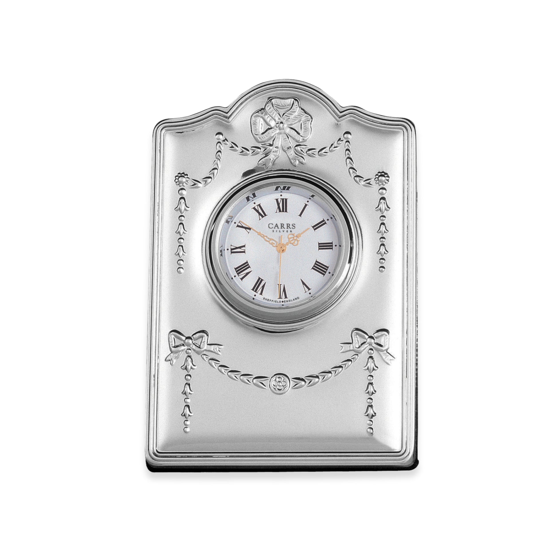 The Carrs Silver Regency Clock, crafted in hallmarked sterling silver, features ornate scrollwork and classical British styling — an elegant addition to any desk or mantel.