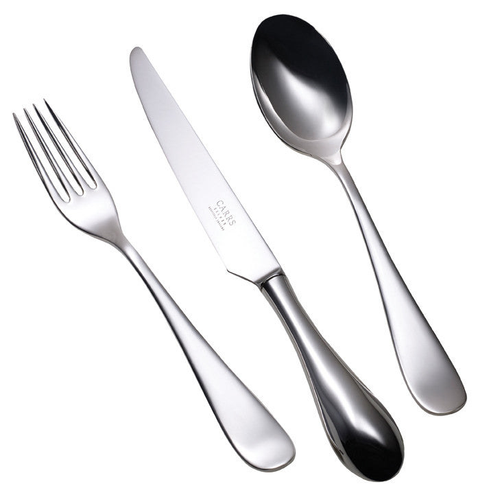 Carrs silverplate is crafted using a pure silver top coating on a nickel silver base. A strong alloy designed expressly for this purpose, nickel silver is comprised of a special blend of copper, zinc, and nickel. This durable base is then plated with pure silver, to a thickness of 20 microns. With use, silverplated cutlery will also develop a nice patina, similar to that of sterling. For those with negative preconceived notions about silverplate, it is extremely durable and easy to care for. In the event the plating should show signs of wear, it can be easily and cost effectively re-dipped.