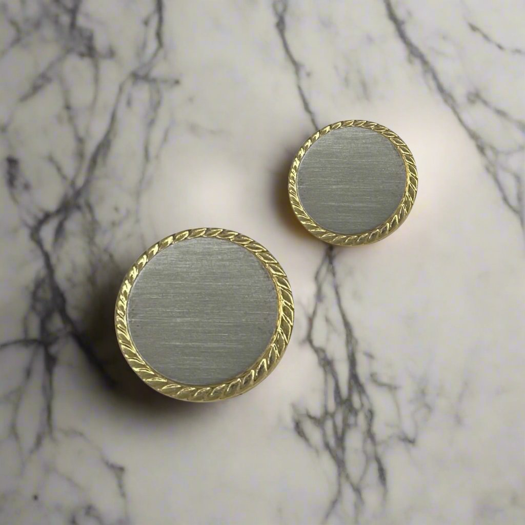 This sterling silver engravable blazer button is made in the United States. It features a brushed center field and a 23K gold-plated rope edge. They are priced per button.