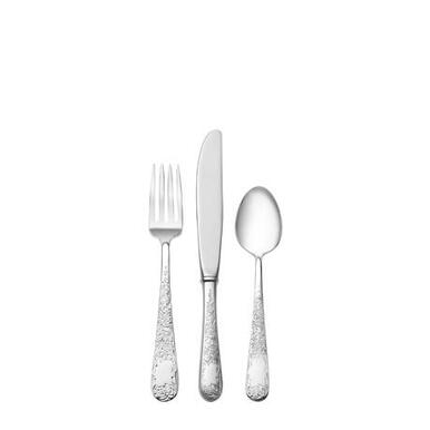 This substantial flatware makes a dramatic statement on traditional and modern settings alike, and will complement any meal from casual to formal. Polish your sterling silver once or twice a year, whether or not it has been used regularly. Hand wash and dry immediately with a chamois or soft cotton cloth to avoid spotting. Knife, Fork and Spoon sized for a child's easy use. Sold as a set of three pieces (fork, knife & spoon) or individually.