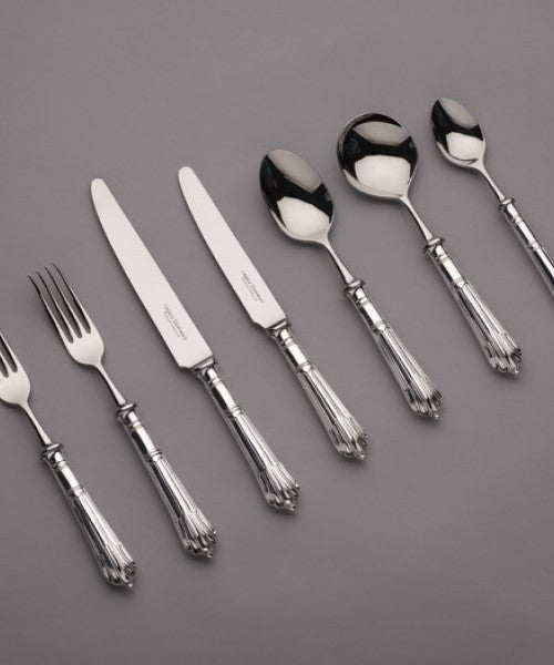 Legacy Silverware silverplate is crafted using a pure silver top coating on a nickel silver base. A strong alloy designed expressly for this purpose, nickel silver is comprised of a special blend of copper, zinc, and nickel. This durable base is then plated with pure silver, to a thickness of 20 microns. With use, silverplated cutlery will also develop a nice patina, similar to that of sterling. For those with negative preconceived notions about silverplate, it is extremely durable and easy to care for. In the event the plating should show signs of wear, it can be easily and cost effectively re-dipped.