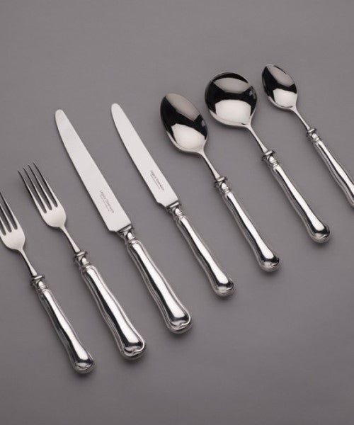 Legacy Silverware silverplate is crafted using a pure silver top coating on a nickel silver base. A strong alloy designed expressly for this purpose, nickel silver is comprised of a special blend of copper, zinc, and nickel. This durable base is then plated with pure silver, to a thickness of 20 microns. With use, silverplated cutlery will also develop a nice patina, similar to that of sterling. For those with negative preconceived notions about silverplate, it is extremely durable and easy to care for. In the event the plating should show signs of wear, it can be easily and cost effectively re-dipped.