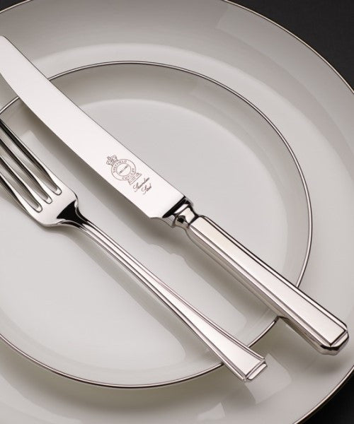Legacy Silverware silverplate is crafted using a pure silver top coating on a nickel silver base. A strong alloy designed expressly for this purpose, nickel silver is comprised of a special blend of copper, zinc, and nickel. This durable base is then plated with pure silver, to a thickness of either 10 or 20 microns. With use, silverplated cutlery will also develop a nice patina, similar to that of sterling. For those with negative preconceived notions about silverplate, it is extremely durable and easy to care for. In the event the plating should show signs of wear, it can be easily and cost effectively re-dipped.