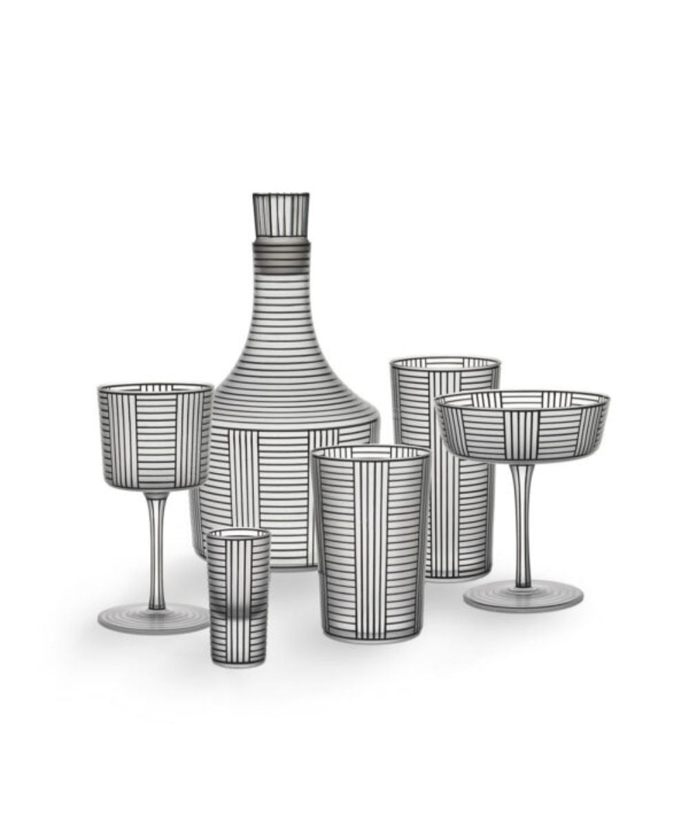 In 1914 Lobmeyr edited the set for the first time, executed in mat glass with black enamel decoration. It was also distributed through the shops of the Wiener Werkstätte.