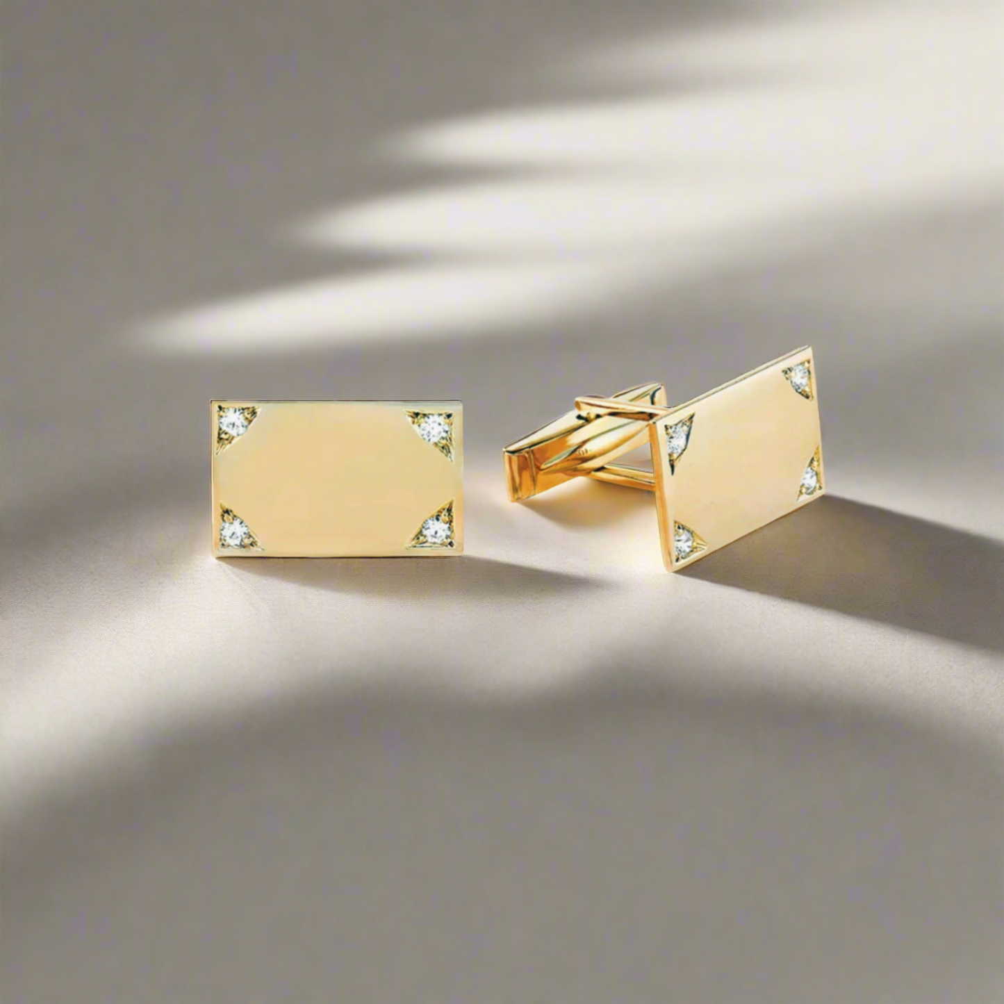 Rectangular 14K gold cufflinks with 0.16 cttw, made in the United States. Ideal with formalwear, this pair of gold diamond cufflinks can be engraved.