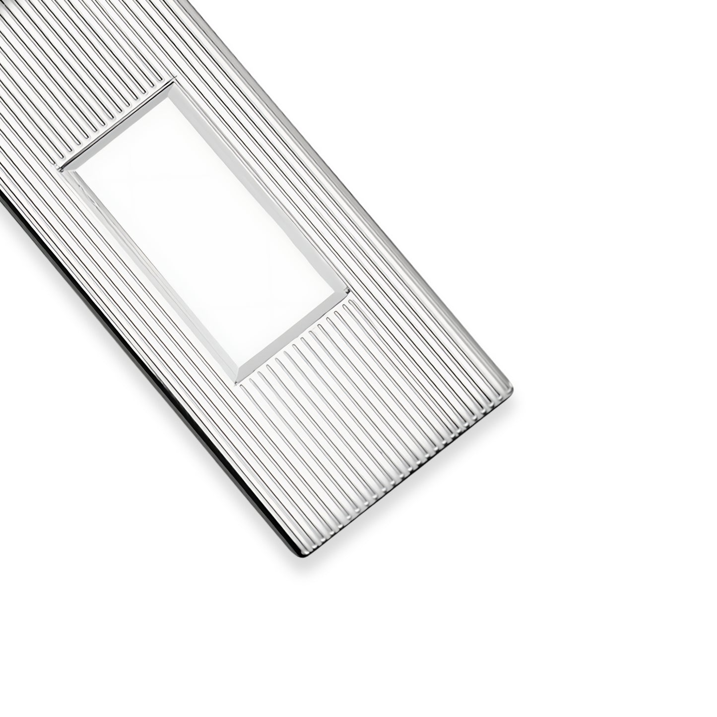 Silver money clip with an engine turned groove pattern running along the face with a center field suitable for engraving — made in the United States of sterling silver.