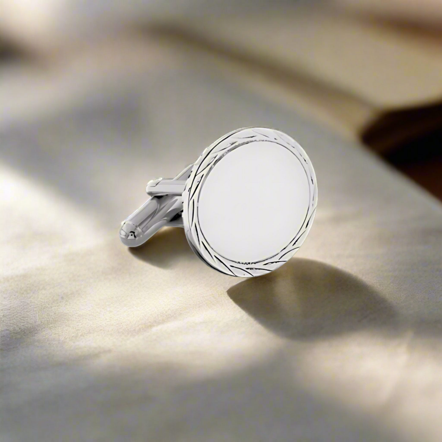 This pair of men's sterling silver cufflinks has a hand engraved feathered edge design. Engraving can be added at no additional cost — a range of styles is available.