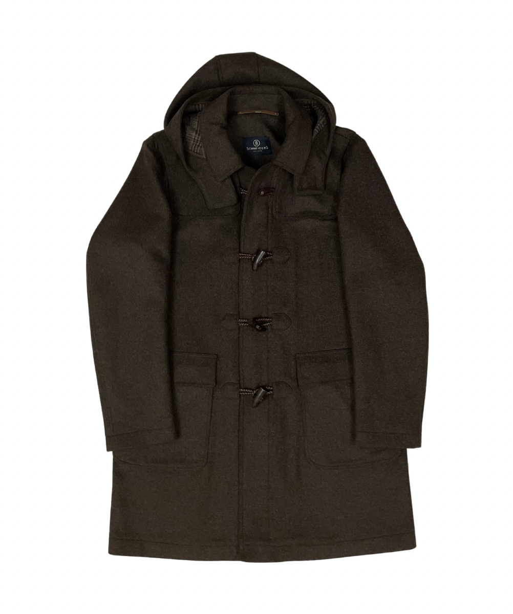 Classic men's duffle coat design made with a water and wind resistant wool-blend material. Crafted for us by Schneiders Salzburg this updated version of a classic men's duffle coat boasts traditional features with modern, practical materials. Button-out detachable hood with double loden check lining, stand-up hood collar with double button closure in front, large front gusset pockets with cover flap, and traditional horn and braided leather toggle closures with hidden zipper — a truly handsome men’s toggle coat. Impeccably crafted in Austria by Schneiders Salzburg for The Lanam Shop.