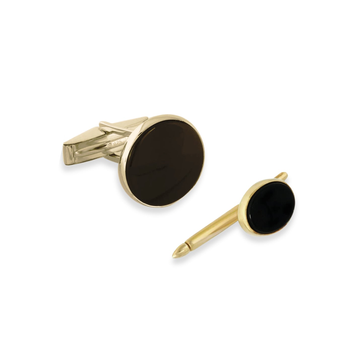 A black tie accessory, this vermeil cufflinks and tuxedo stud set is made in the United States of 24K gold plated sterling silver and features genuine black onyx.
