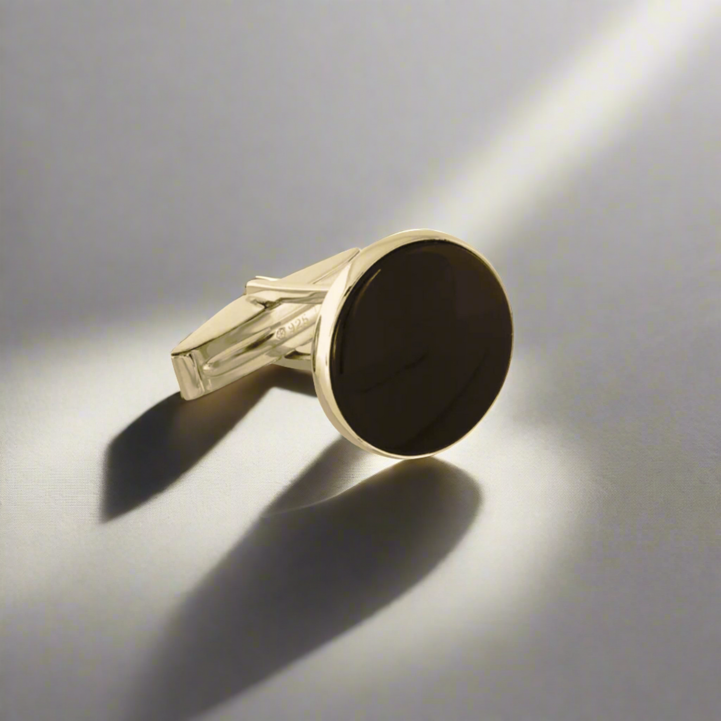 Pair of genuine onyx cufflinks, set in sterling silver that has been plated in 24K gold. Made in the United States, this pair of onyx cufflinks is suitable with a range of formalwear.