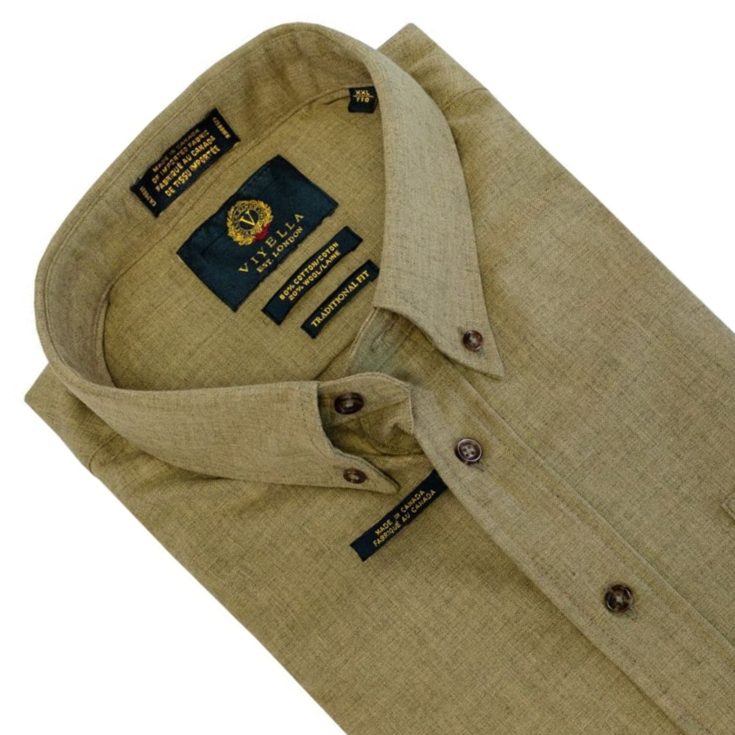 Solid shiitake beige men's Viyella sport shirt. Made in Canada using a premium Merino wool and long-staple cotton blended fabric. Complimentary embroidery available.