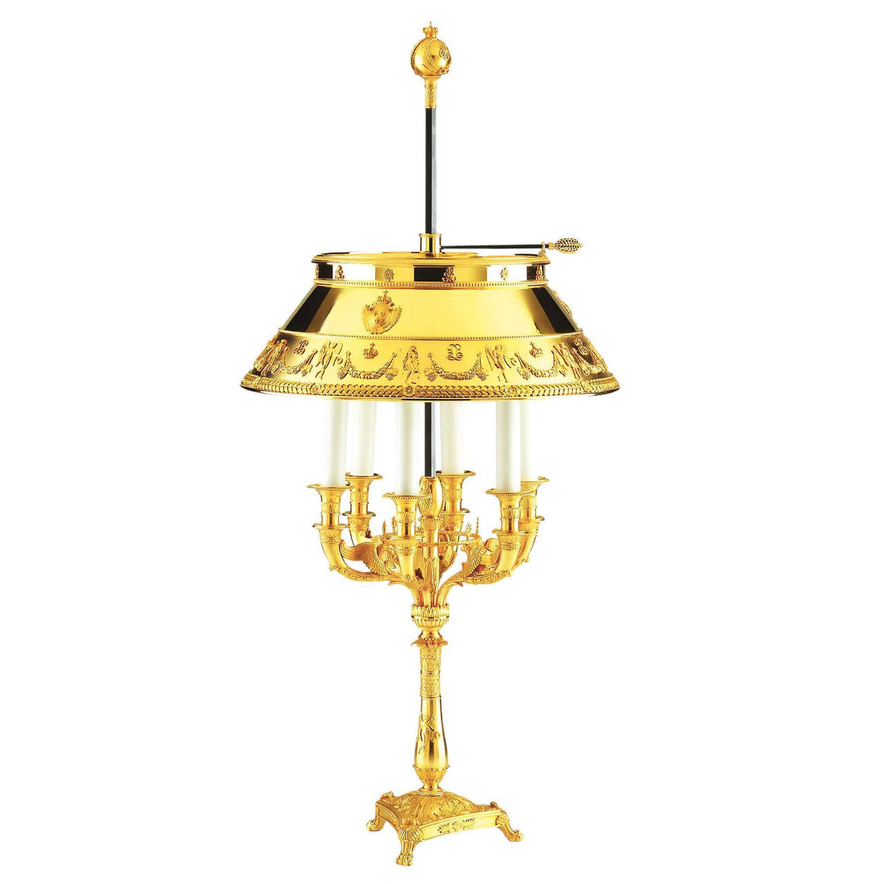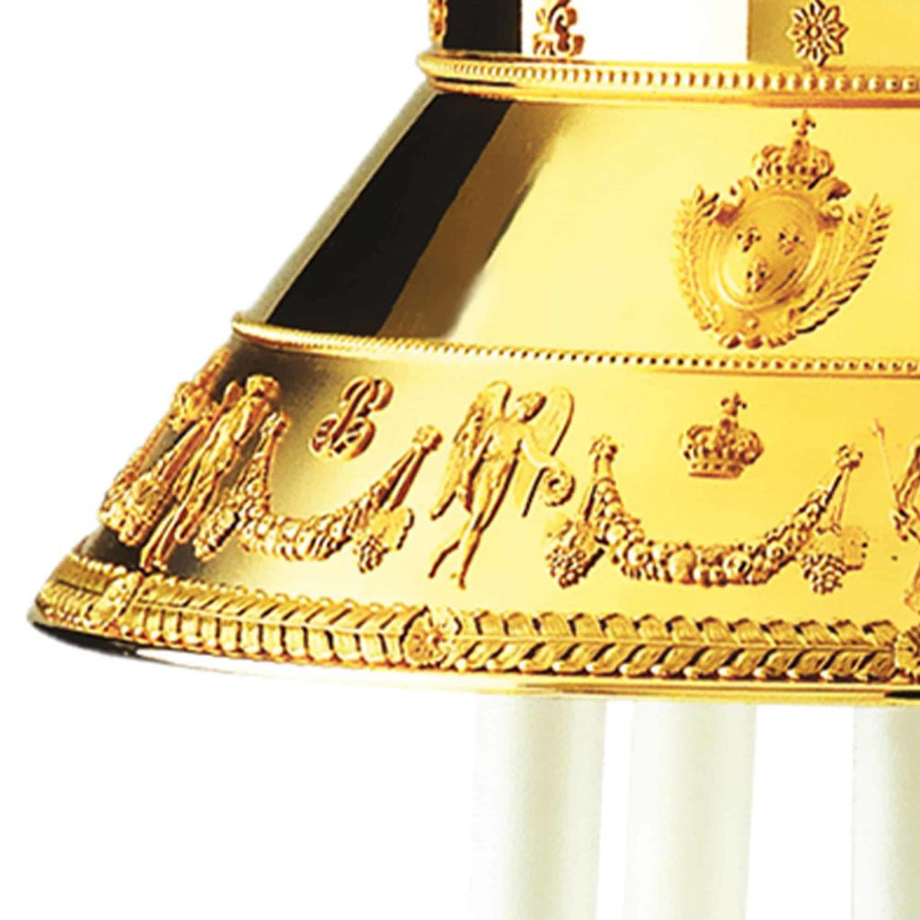 "The bottom of this lamp is composed of a tripod, decorated with lion claws. The lampshade is bordered by a fine frieze, enriched with eighteen figures supporting alternating garlands of the order of the Holy Spirit and the order of Saint Michael, and surmounted by a double L and the royal crown.