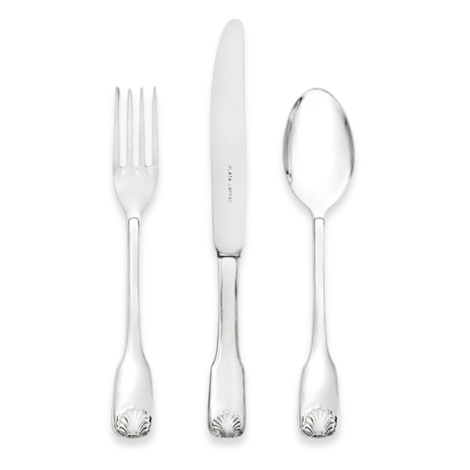 Its characteristic decoration, the scallop shell, brings to mind the glorious Louis XIV period. Handcrafted by the skilled silversmiths at Plata Lappas— the finest silversmith firm in South America. Generously plated with silver, this cutlery set is suitable for daily use or for special occasions.