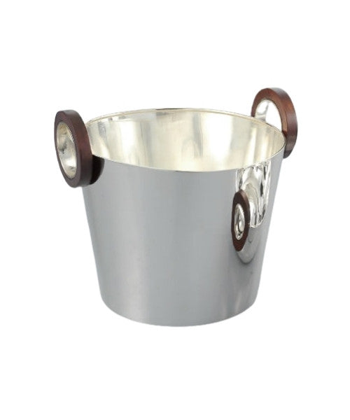 This gorgeous five bottle wine cooler features genuine wood ring handles. A lovely addition to your bar cart, this generously size bucket can hold up to five regular-size wine bottles. The wood handles add the perfect, interesting touch. Coated in a massive-plating of pure silver.