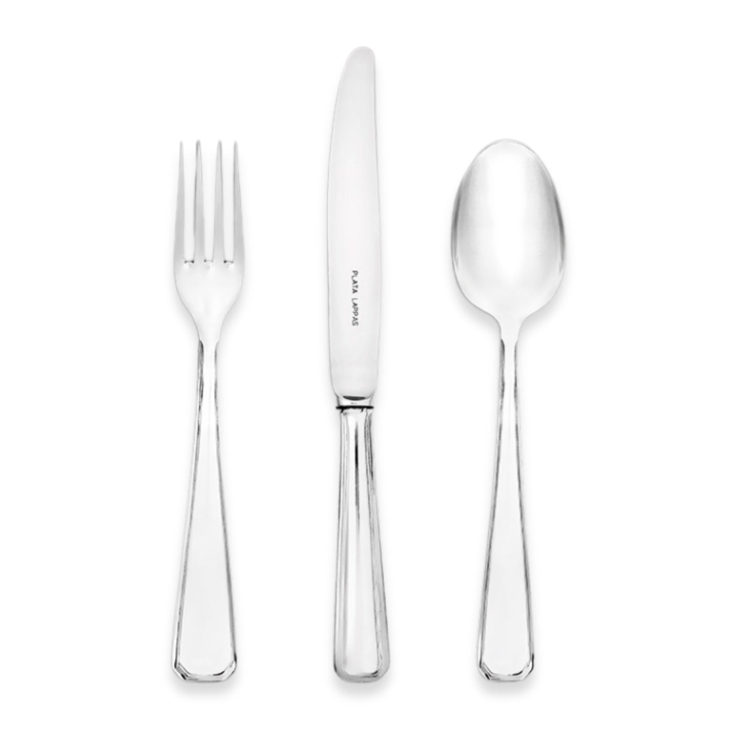Its sheer geometrical lines provide a sober and distinguished style that ably accompanies a modern table setting. Handcrafted by the skilled silversmiths at Plata Lappas — the finest silversmith firm in South America. Generously plated with silver, this cutlery set is suitable for daily use or for special occasions.