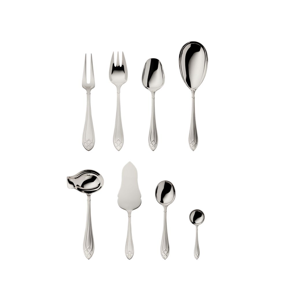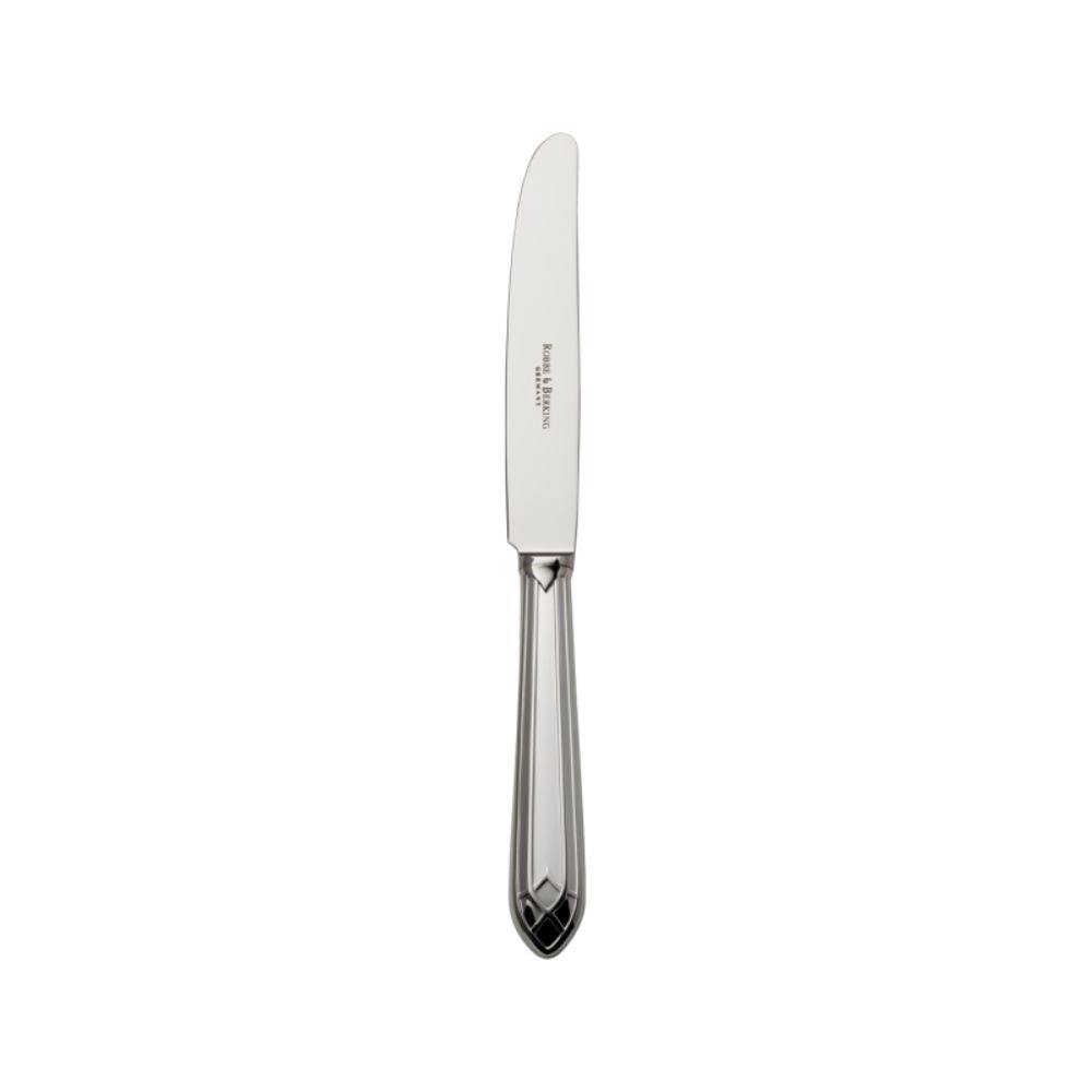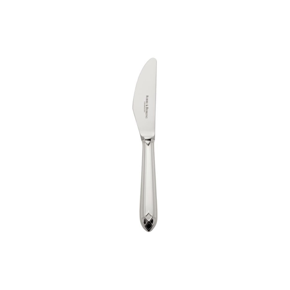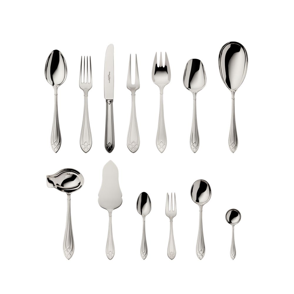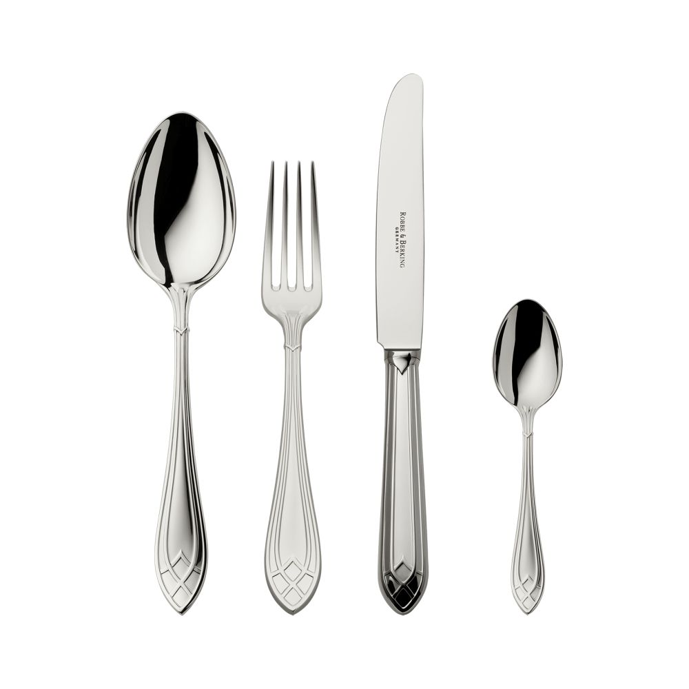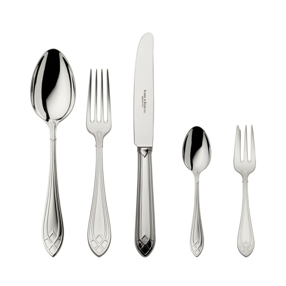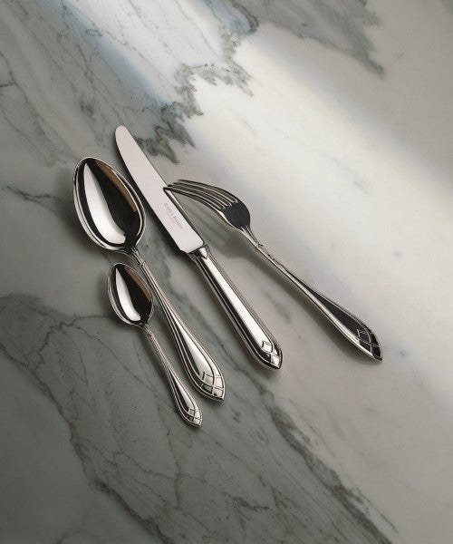 Designed by Robert Berking, the Arcade sterling silver flatware range by Robbe & Berking features a unique, eye-catching design. Berking was inspired by the grand, ancient arcades found along the Mediterranean Sea — slender bands along the sides converge in a single tapered point at the tip. This design traces continuously along the front and reverse of the individual pieces. Crafted in Germany using fine sterling silver, this pattern can be engraved, on request.