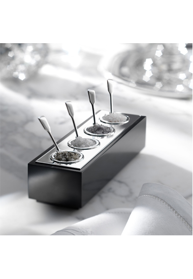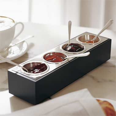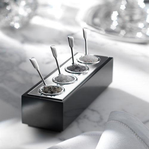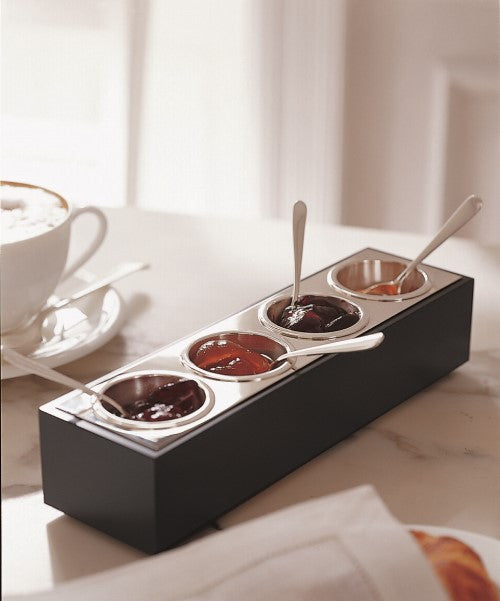 Serve your favorite condiments easily and elegantly. Available in two sizes, each “bar” has four wells perfectly sized for serving. Use it to serve varieties of craft mustards, ice cream sprinkles, gourmet salts, special sugars… the possibilities are endless. Spoons sold separately. Cover is only available in silverplate for the larger size server.