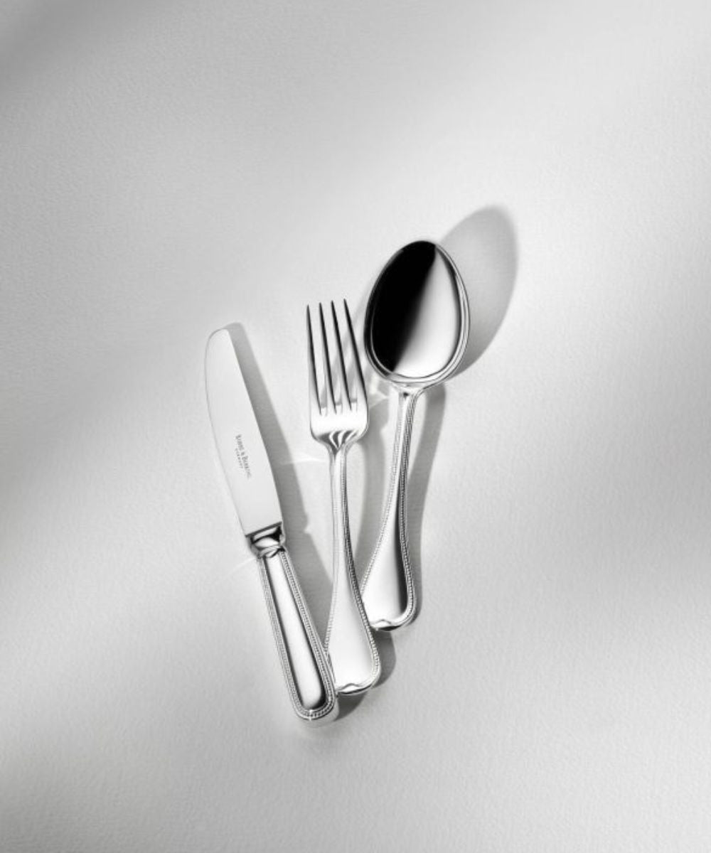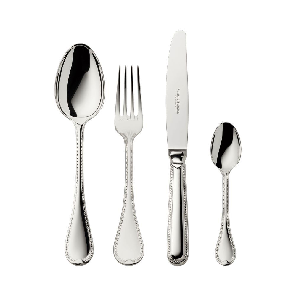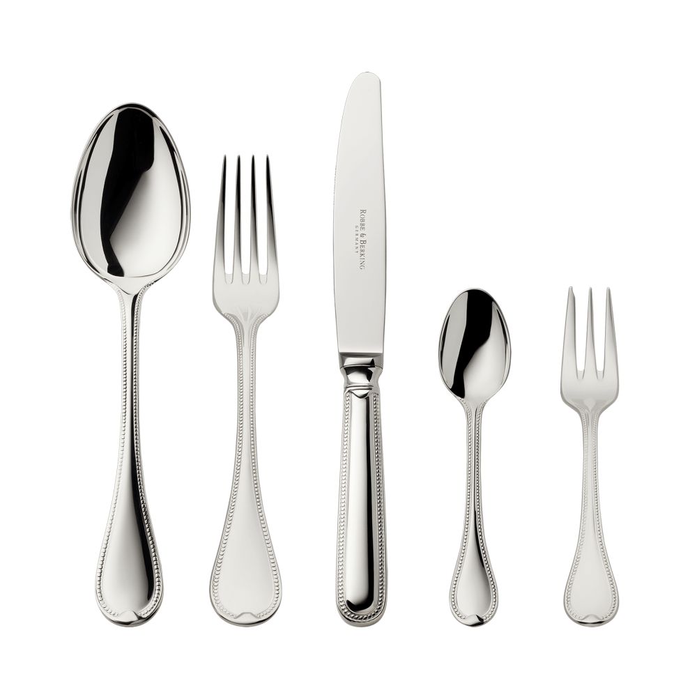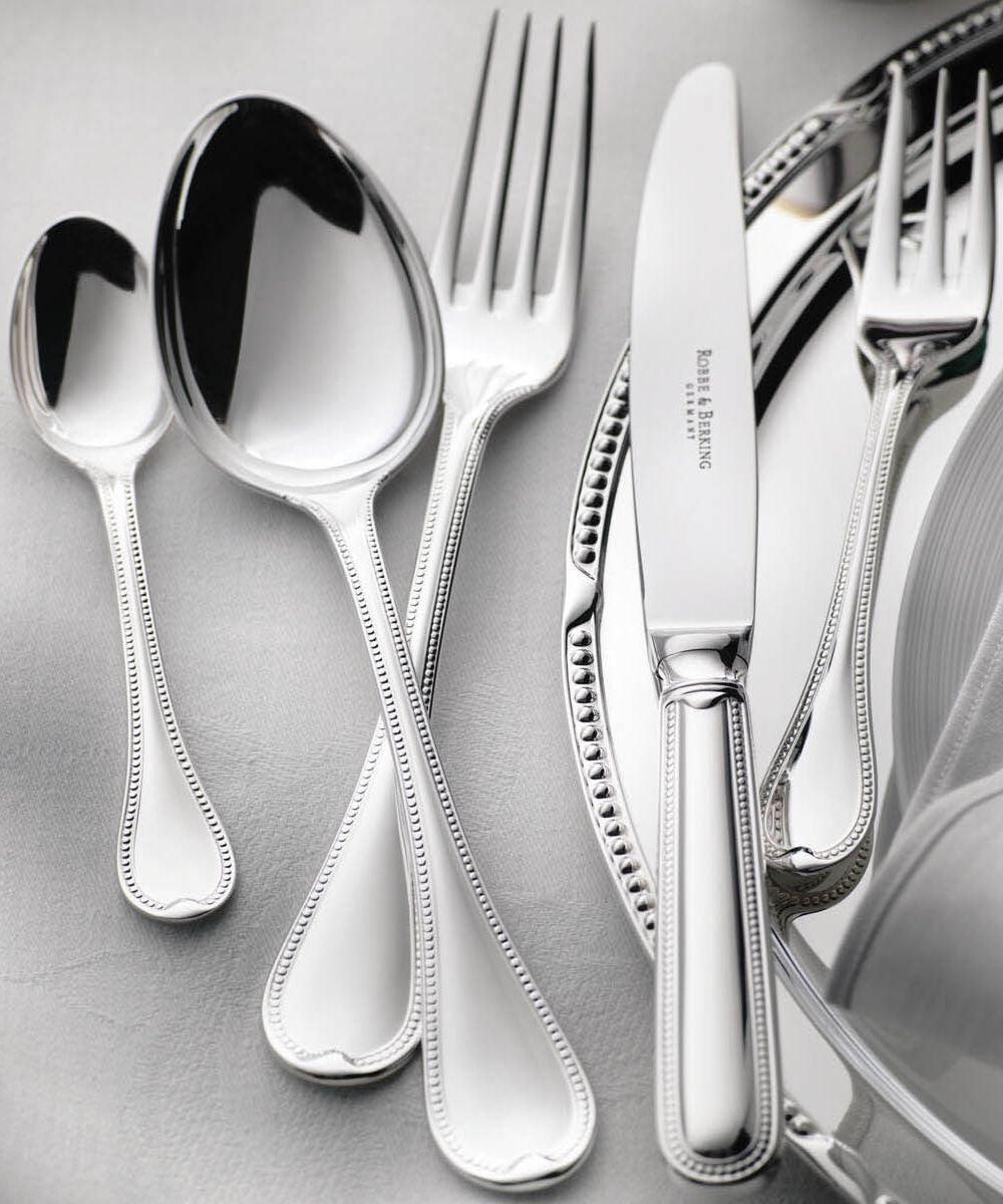 Effortless and elegant, the Französisch-Perl sterling pattern by Robbe & Berking features a timeless beaded edge motif. Impeccably hand-finished, this sterling silver French Pearl flatware collection by Robbe & Berking is offered in a wide range of place-setting and serving pieces. Designed to resemble a fine pearl necklace, the intricate sculpted beads speak to the superb silversmithing Robbe & Berking is known for. For a distinctive take on the beaded sterling flatware pattern, look no further. Engraving services are available.