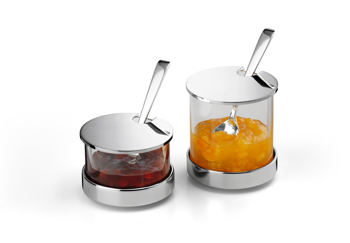 Server jam with class and style. This lovely covered jam server can hold your favorite jam or preserve without creating a sticky mess. Easily cleaned. Jar and lid included.