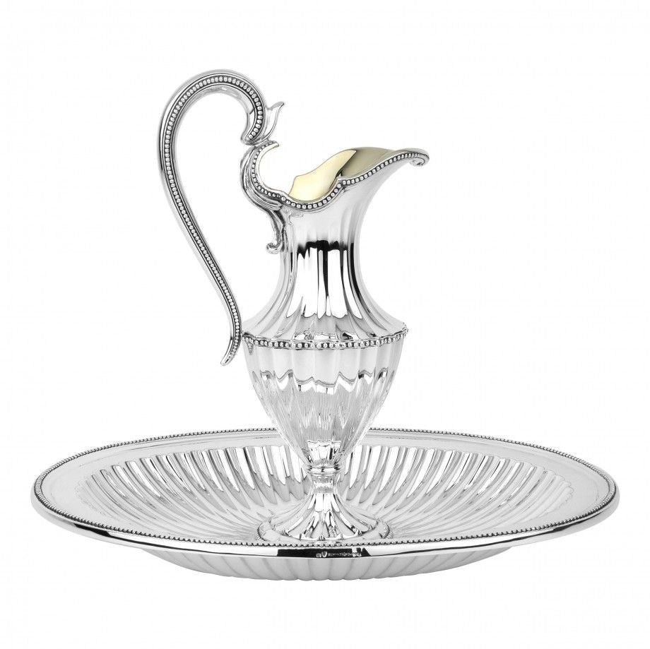 Traditional pitcher and stand design. Scalloped edging on tray and bead edging on the pitcher. Expertly crafted by the silversmiths at Topázio.