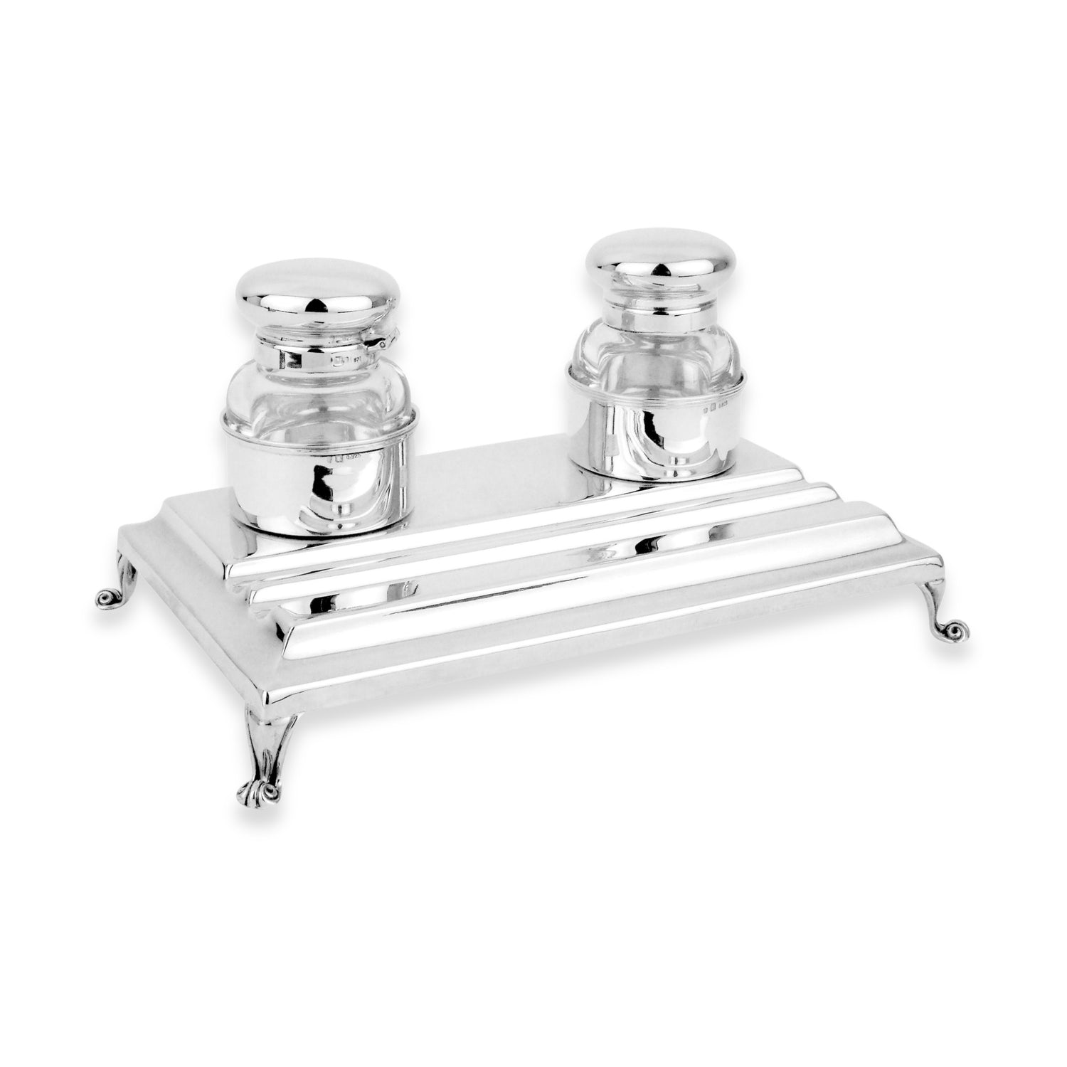 The Topázio Classic Sterling Silver Ink Well is a handcrafted Portuguese desk accessory featuring dual glass inkwells and a polished sterling silver base — perfect for collectors and refined writing spaces.