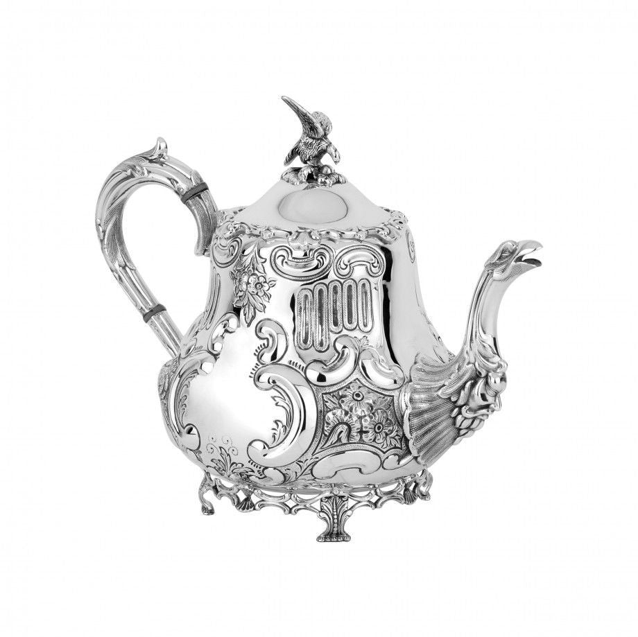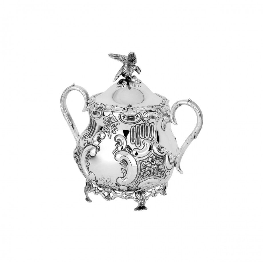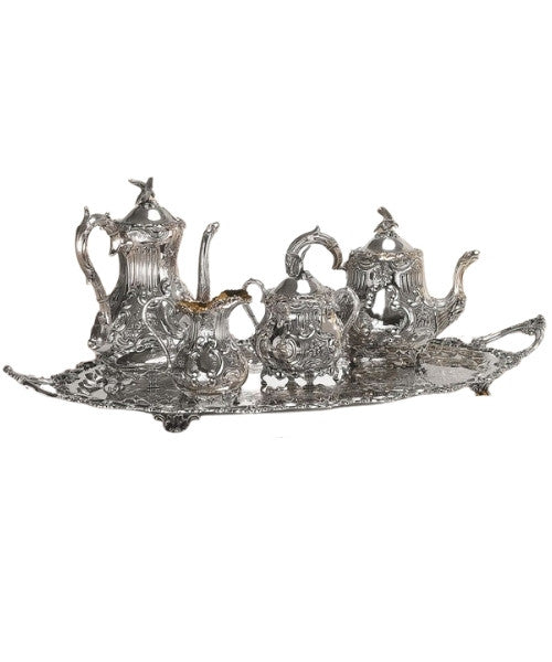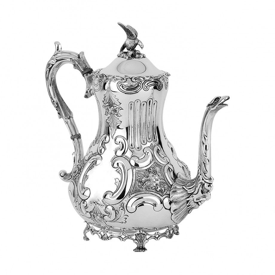 A true masterpiece. This remarkable tea and coffee service is crafted by the skilled silversmiths at Topázio. Handcrafted and hand-chassed, this piece will be an eye-catching addition to your dinning room sideboard. Ornate decorations adorn the exterior of this collection. Bird finial tops covered serving pieces. Open serving pieces have a gold wash on the interior.