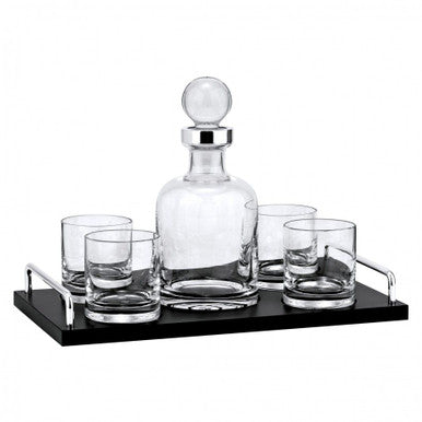 A perfect addition to any space. This six-piece decanter set features four glasses, a decanter and coordinating tray. Lead-Free crystal and silverplate balance form and function in this easy-care set. A coordinating tray is made from handsome black lacquer wood.