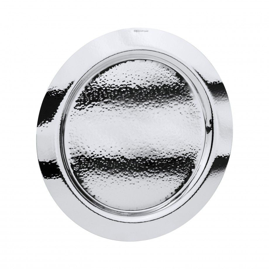 A beautifully hand hammered silverplate round tray. Handmade in Portugal with a pure silver plating.