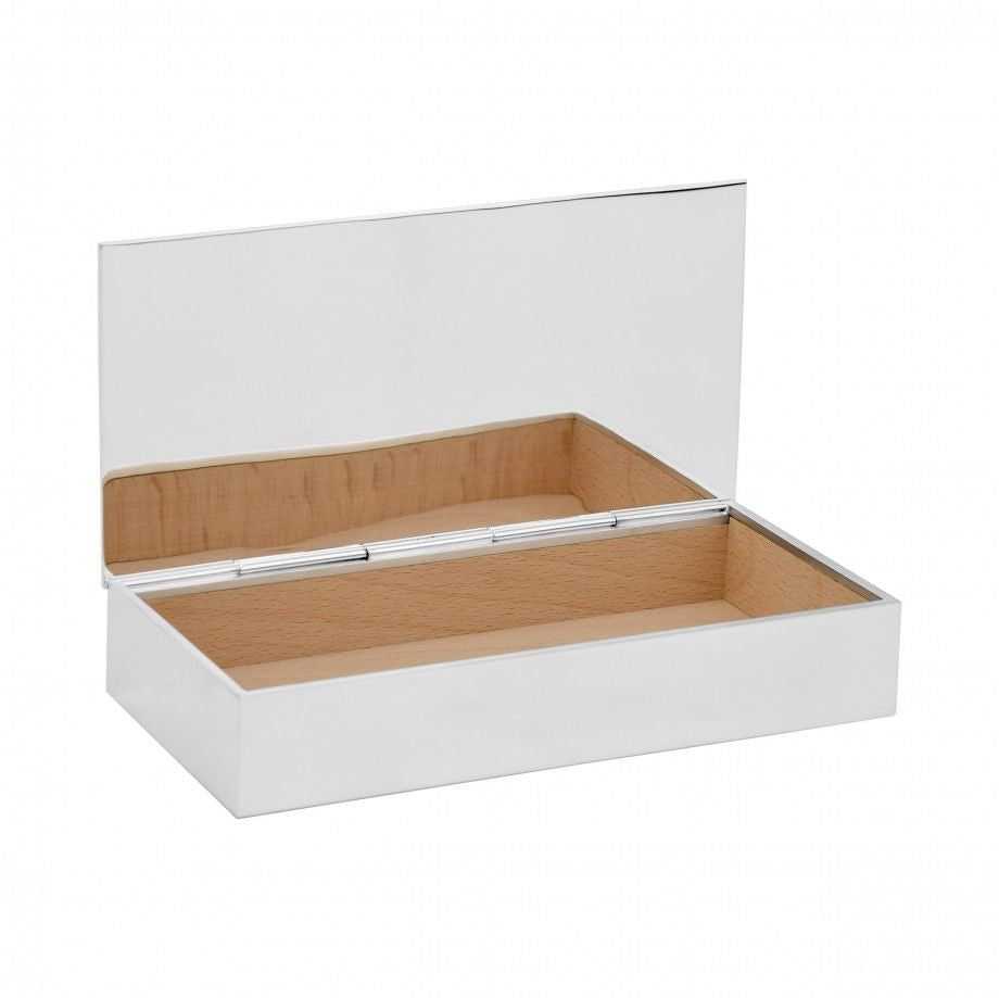 Exquisite and timeless, the Topázio Sterling Silver Box combines classic design with masterful craftsmanship. Handcrafted in Portugal by Topázio, this elegant rectangular box features a smooth, mirror-polished sterling silver exterior and a luxurious wood-lined interior, designed to store valuables with sophistication and care.
