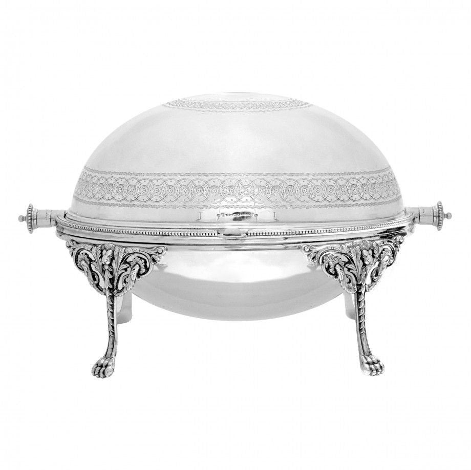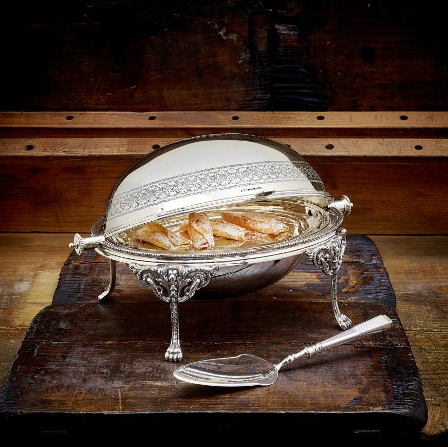 Traditional recency-style covered server dish. The roll-top neatly stores under the removable serving plate. Crafted by the expert silversmiths at Topázio. Handmade, hand-chased serving dish. Made with over six pounds of sterling silver.