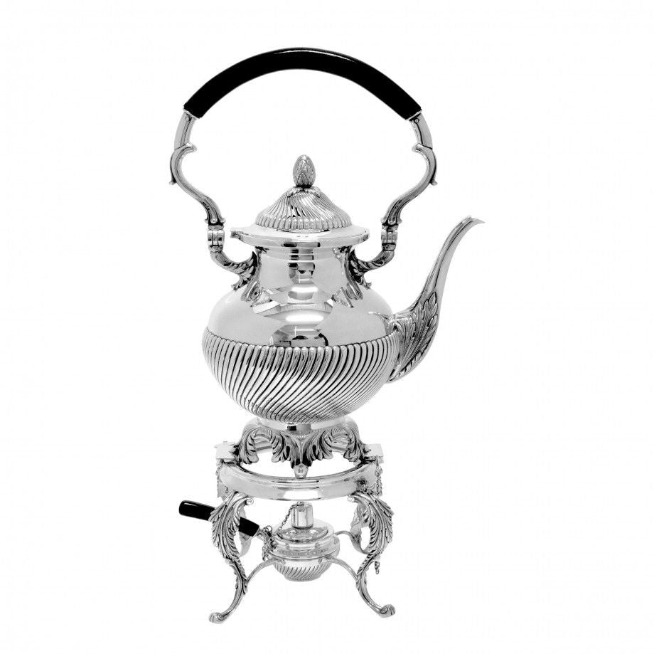 Keep water for tea at the perfect temperature. This elegant solution to the ‘cold’ pot allows a sterling silver teapot to sit atop a sterling silver base that has a burner built-in. the elegantly understated swirl pattern is a popular choice for both modern and classically decorated interiors.