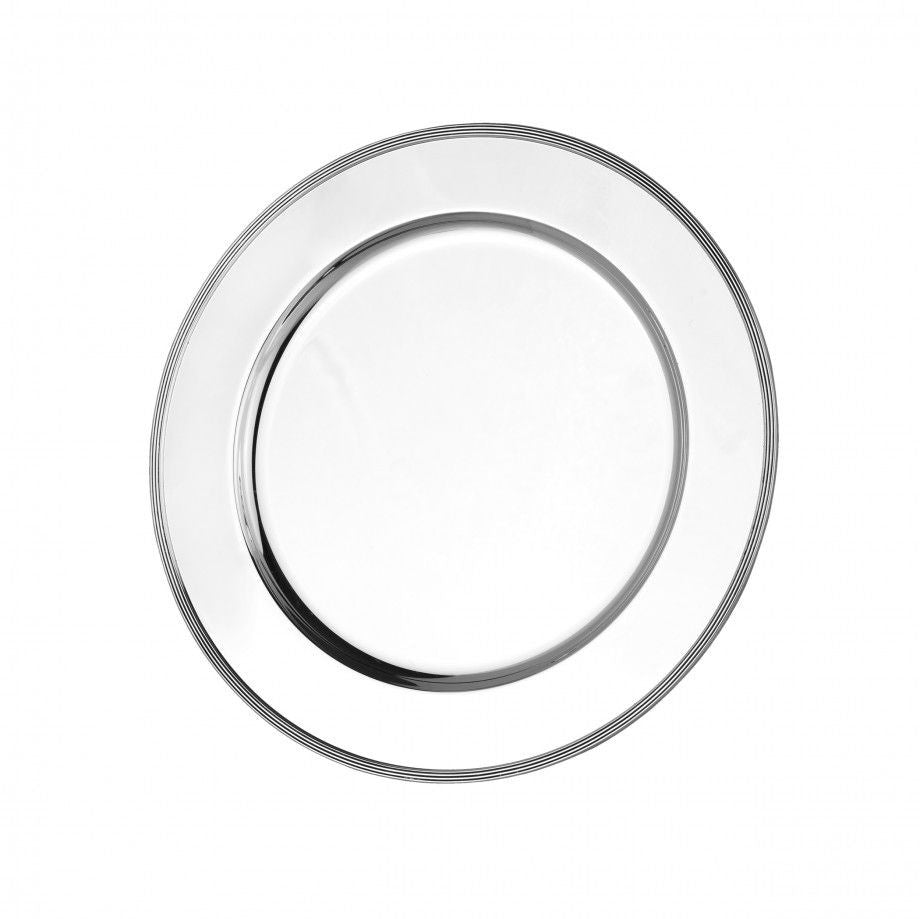 A timeless silverplate charger, with linear motif along the edge of the silver underplate. Crafted in Portugal with a durable coating of silverplate.