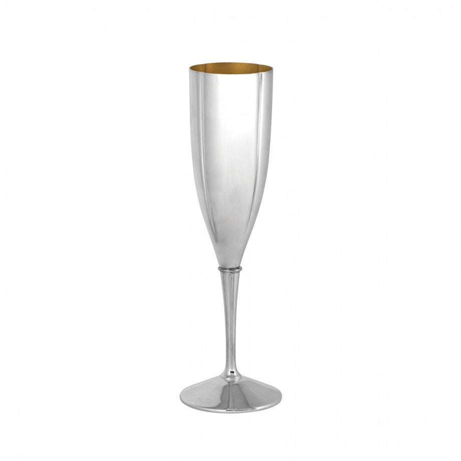 Traditional design silverplate champagne flute. A thick plating of pure silver is expertly applied to the exterior and a gold flash plating is applied to the interior, giving this piece wonderful contrast.
